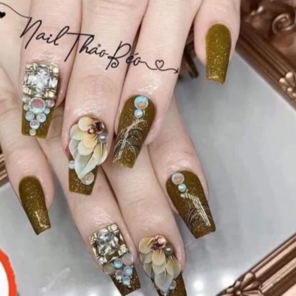 Thiết kế móng: Thiết kế góc hoa với ngọc đính chính giữa